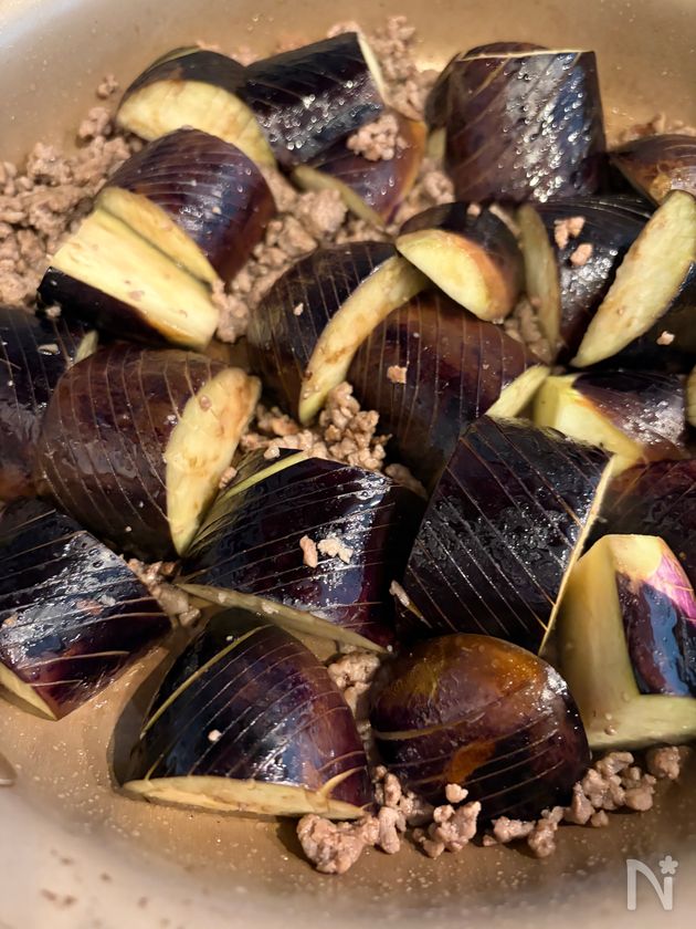 (1) フライパンにサラダ油を入れて火をつけ、牛ひき肉を炒める。色が変わってきたら茄子を入れて炒める。