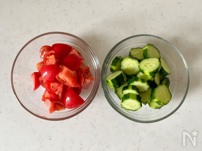 (1) きゅうりは皮を3箇所ピーラーでむき、8mm厚の輪切りにする。トマト(ミディトマト)は横半分に切ってから十字に切る。