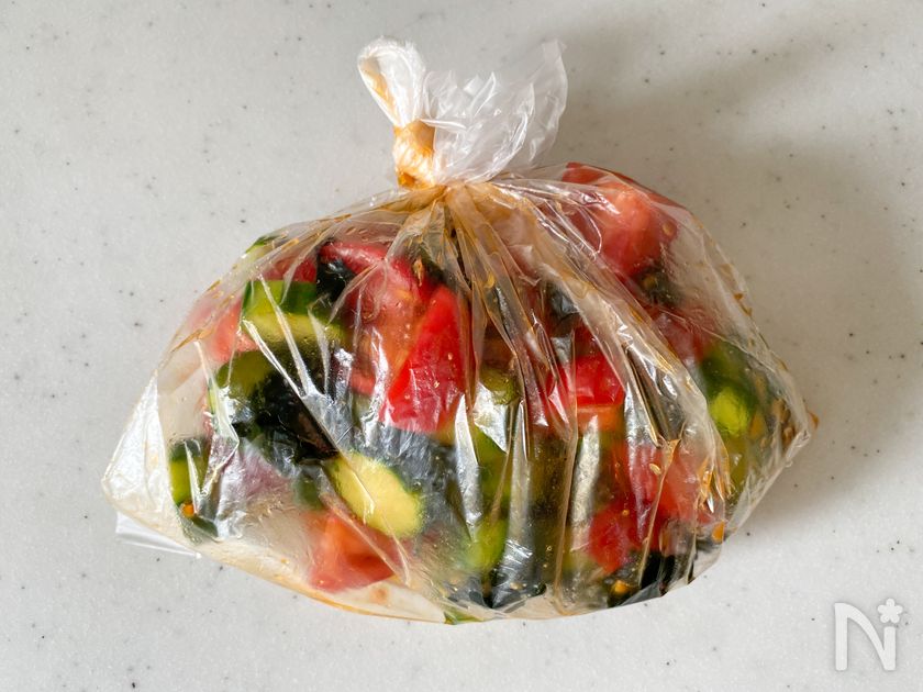 (2) ポリ袋に1を入れ、乾燥わかめ、【A】を加えて袋の口を閉じ、調味料が行き渡るまでやさしく揉む。冷蔵庫に20分ほど置き、途中で向きを変える。器に盛り付け、お好みでごまをふる。