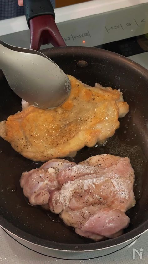 (1) 鶏モモ肉の両面に塩.胡椒・米粉をまぶし、油をひいたフライパンで皮目を強中火で焼く。焼き色がついたら裏返し、弱火で身側を5分焼く。