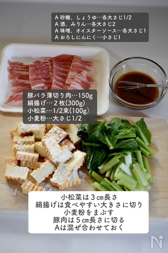 (1) 小松菜は3㎝長さ、厚揚げ(絹揚げ)は食べやすい大きさに切り、小麦粉をまぶす。豚バラ薄切り肉は5㎝長さに切る。【A】は合わせておく。