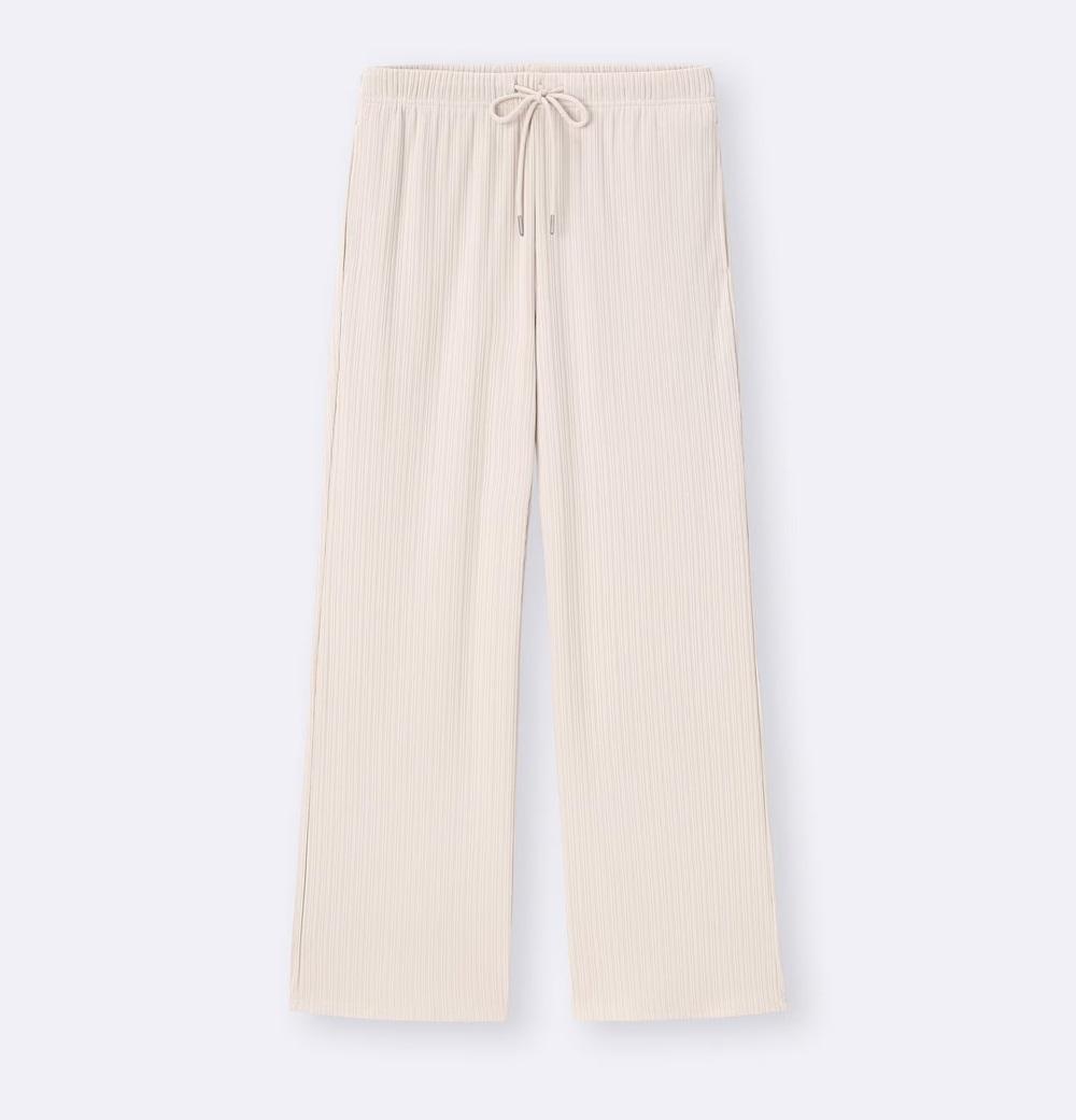さっとはけてキマるプルオン型のパンツで、微フレアなシルエットとリブ素材が「細見えする」と好評です。