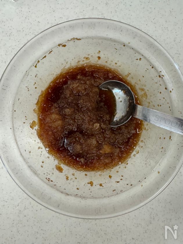 ・【B】を耐熱容器に入れ、電子レンジ(600w)で、ラップをせずに、3分加熱し、粗熱をとる(※容器は大きめのものを使用する)大根をすりおろし、水分を切って、混ぜ合わせる。