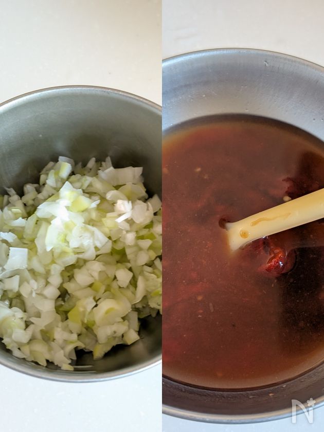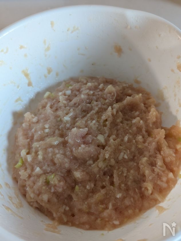 (2) 鶏ひき肉、白ねぎ、卵を割り入れ、【A】を入れて、混ぜ合わせる。