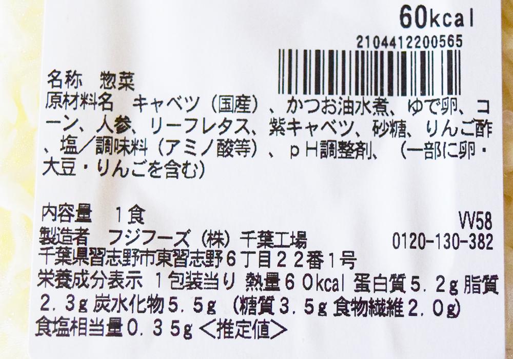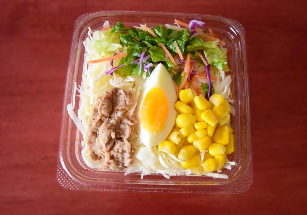 シーチキンとコーンをメインにしたシンプルなサラダです。3社の中で唯一ミニトマトが入っている一方で、たまごは使用されていません。