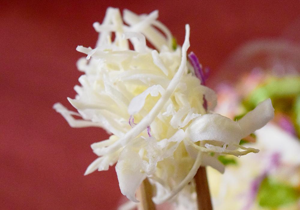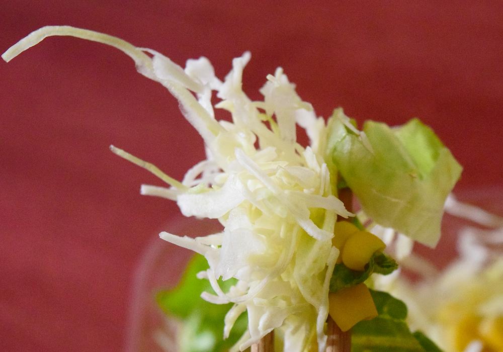 千切りキャベツをベースに、ツナやコーンなどがトッピングされた構成になっています。