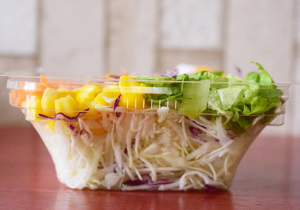 シーチキンとコーンに加え、5品目の野菜(キャベツ・紫キャベツ・人参・コーン・グリーンリーフ)を使用したサラダです。