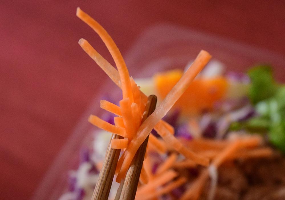 3社の中では、最も彩りが豊かに見えます。千切り人参の量が多いことも、その要因かもしれません。