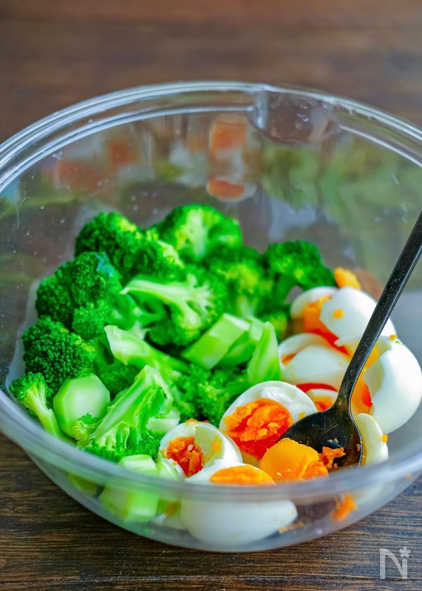 (3) ボウルにブロッコリー、ゆで卵を加えてゆで卵を軽く潰す。