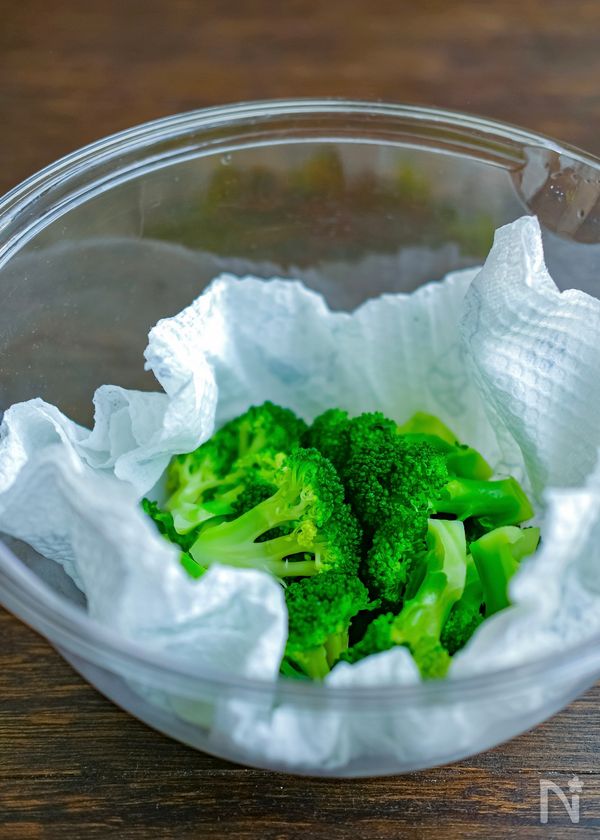 (2) ブロッコリーは小房に切り、茎部分は筋から皮まで厚くそぎ落とし、食べやすく切り、1リットルの水に対して塩(分量外)小さじ2を加えたお湯で1分30秒茹で、ザルに上げて粗熱を取ってから重ねたキッチンペーパーで包むようにして水気を取る。