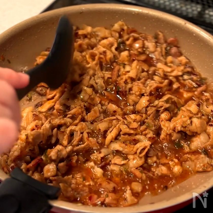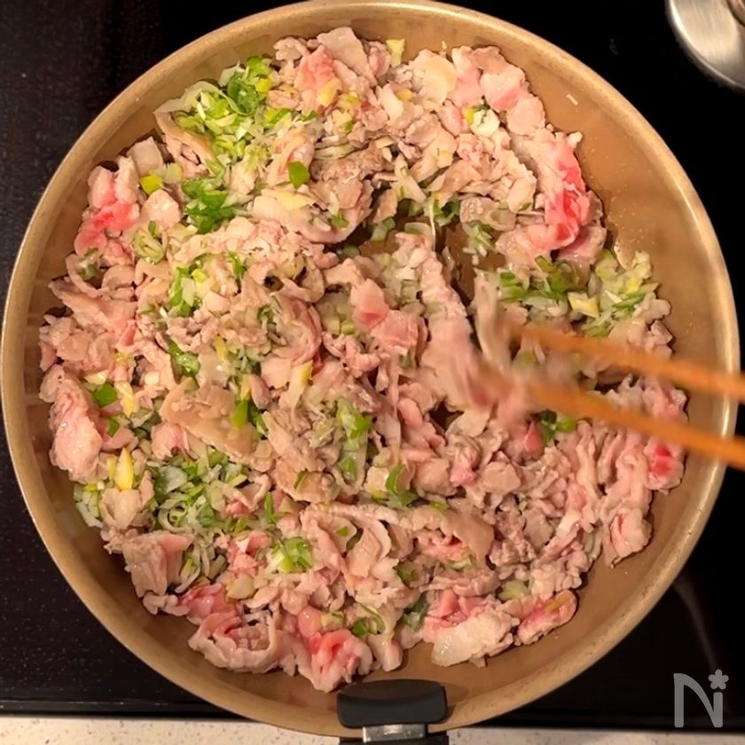 (1) フライパンに油を熱し、豚バラを炒めてある程度火が通ったらねぎも入れて炒める。