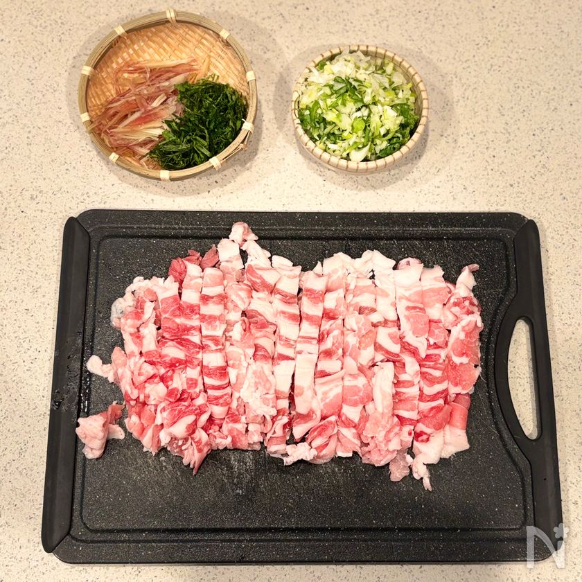 (下準備) 豚バラ薄切り肉は1cm幅に切る。