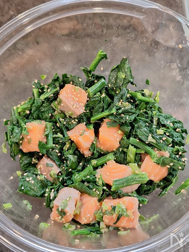 ちぢみほうれん草の甘み引き立つ ねぎ塩サーモン和え