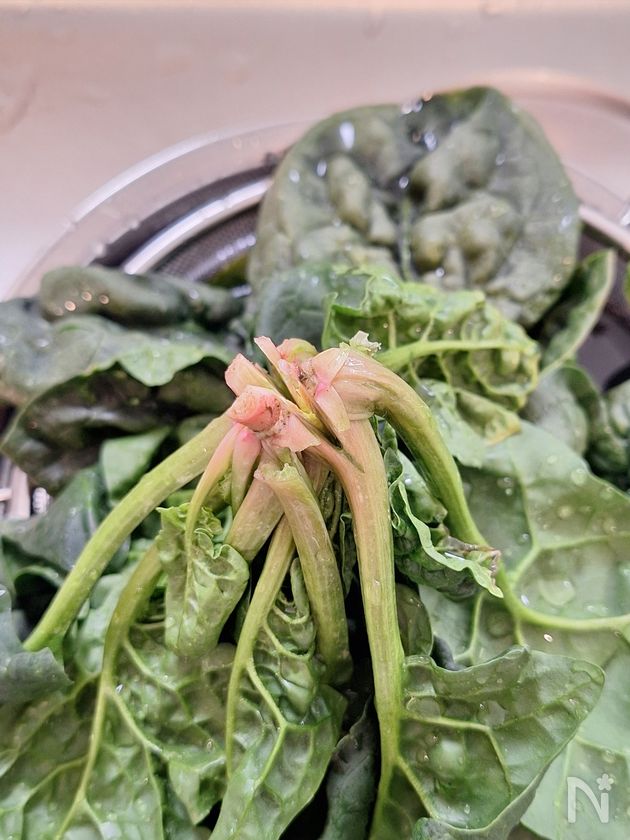 (1) ちぢみほうれん草は根元に十字に切り込みを入れ、ため水でふり洗いしたあと、流水でよく洗う。