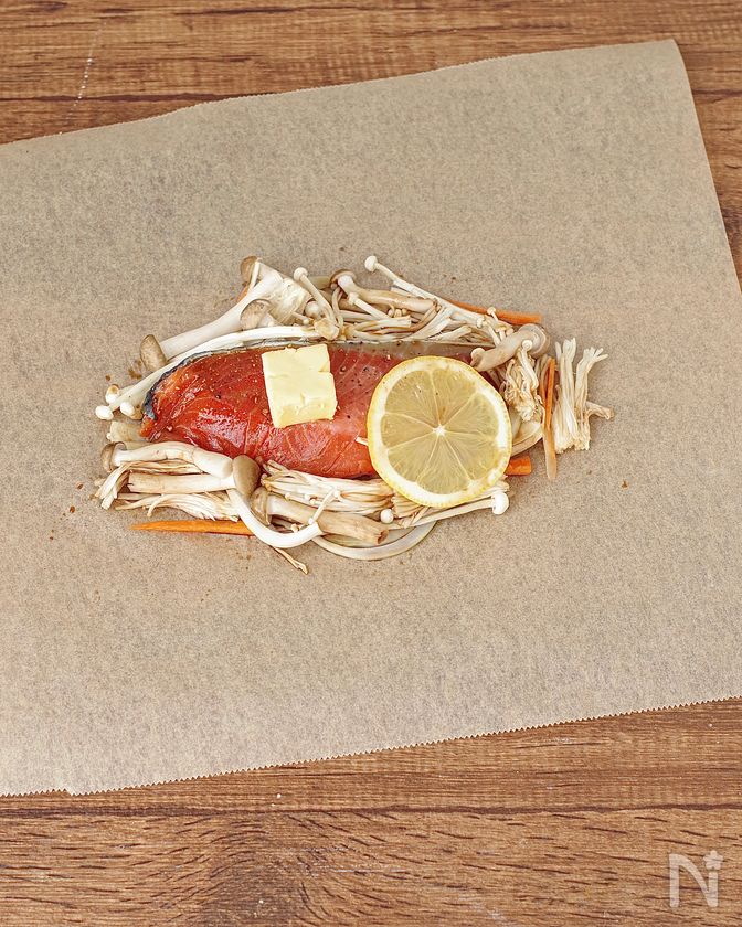 (2) クッキングシートに玉ねぎとにんじんの半量をのせ、生鮭を1切れ置く。まわりにしめじとえのきの半量を並べ、混ぜ合わせた【A】を半量かける。有塩バター半量とレモンスライスを1枚のせる。