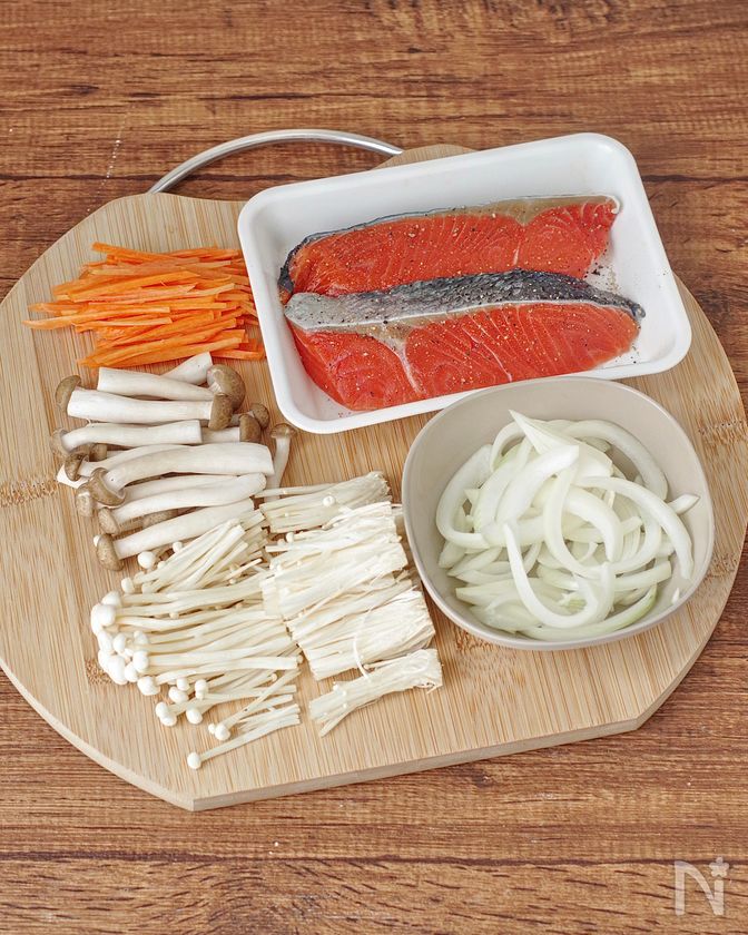 (1) 生鮭は塩こしょうを振る。玉ねぎは薄切り、にんじんは千切りにする。しめじは石づきを切り落としてほぐし、えのきは石づきを落として半分に切り、根元をほぐす。
