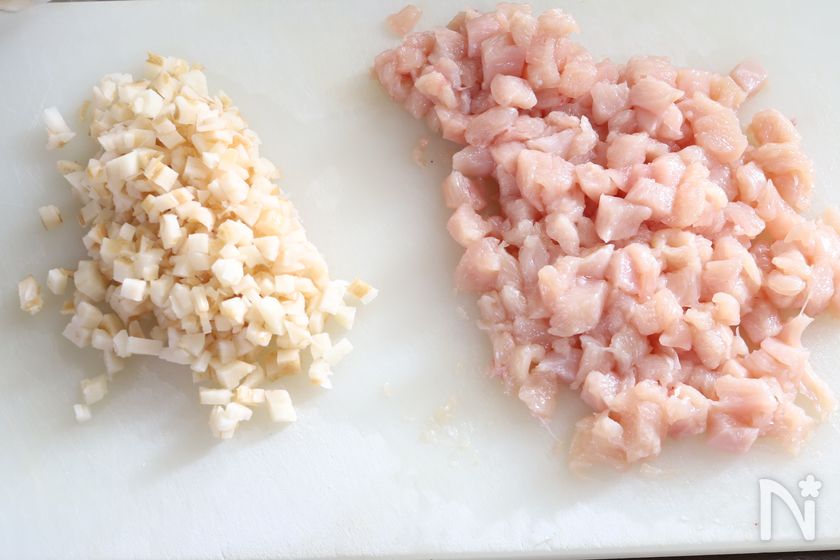(1) 蓮根は皮を剥き粗みじん切り、鶏むね肉は1cm角に切る。