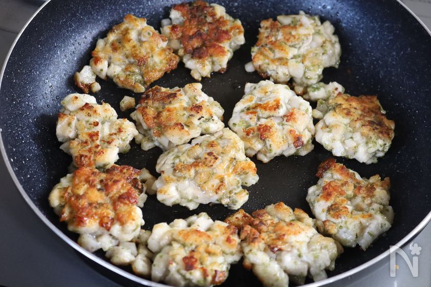 (3) フライパンにサラダ油をひき、②を並べて焼き色がつくまで中火で焼いたら、ひっくり返して蓋をし、弱火で5分蒸し焼きにする。中まで火が通ったら、再び火を強めて両面カリッとするまで焼く。