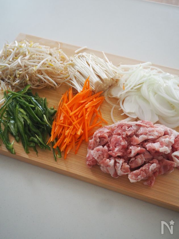 (1) えのきは石づきを切り落として、ピーマンとにんじんは細切り、たまねぎは薄切り、豚のこま切れ肉は細かく切り、もやしは洗っておく。