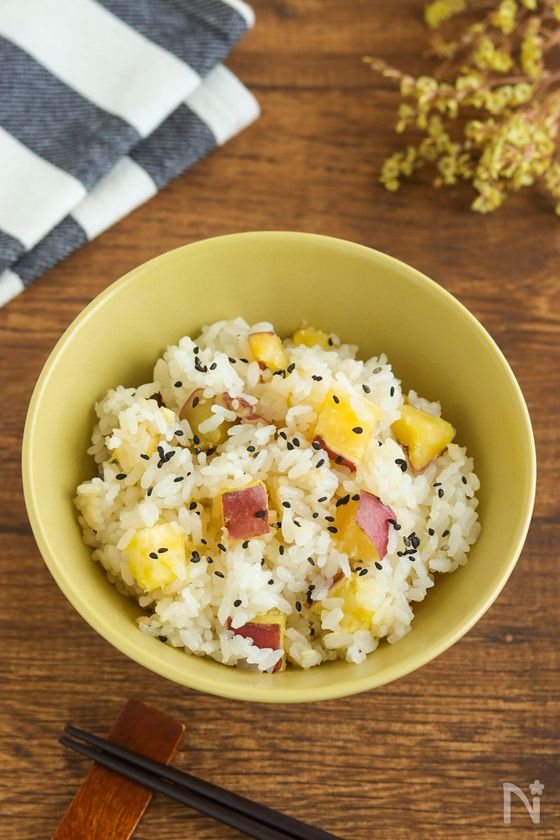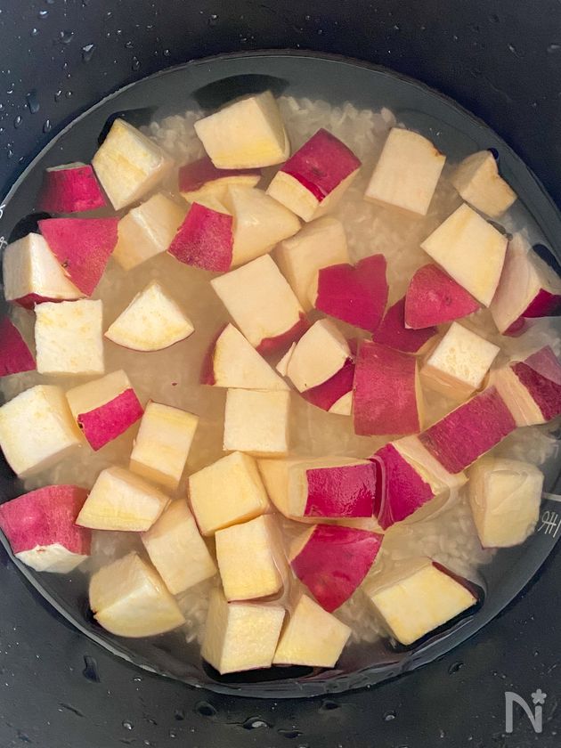 水気を切ったさつまいもをのせて、普通モードで炊飯する。