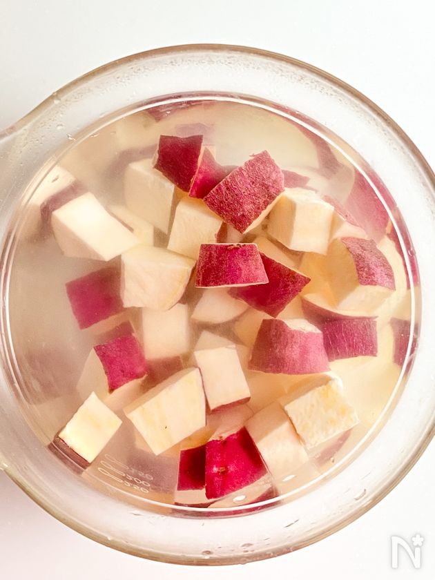 (1) さつまいもは1.5cm角に切り、水にさらす。