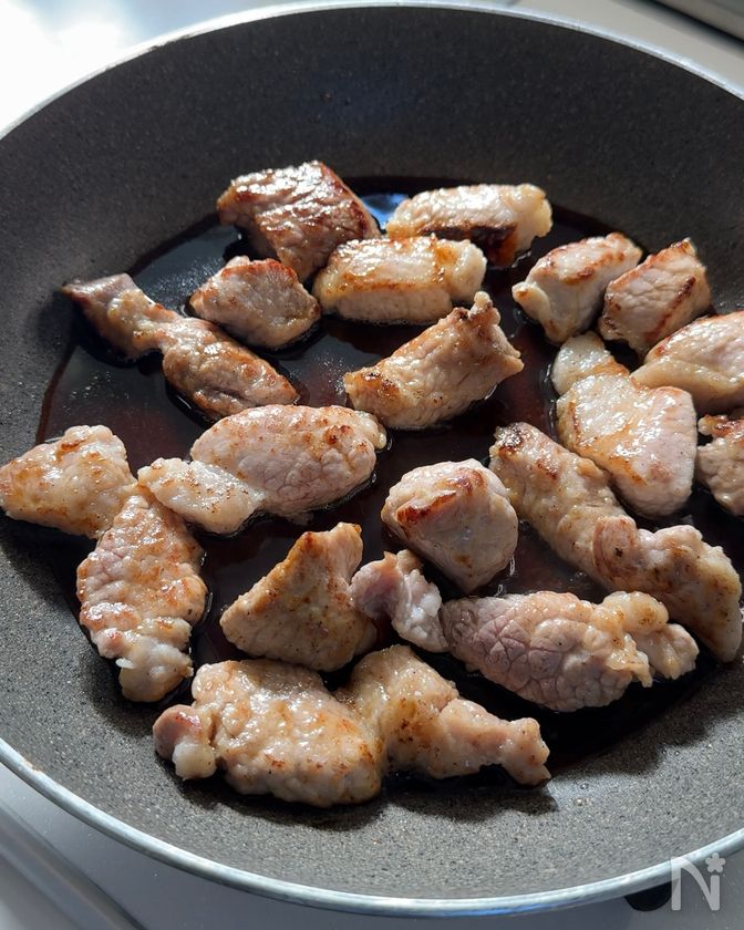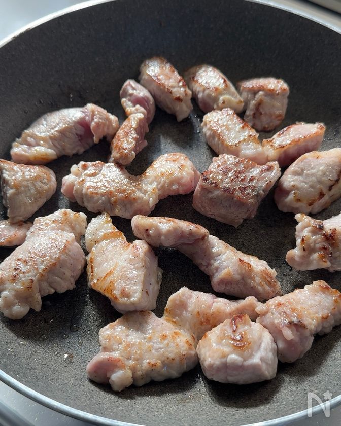 (2) 同じフライパンに豚肉(カレー用の角切り)を並べ、両面に焼き色がつくまで焼く。蓋をして弱火にし、2分ほど蒸し焼きにする。