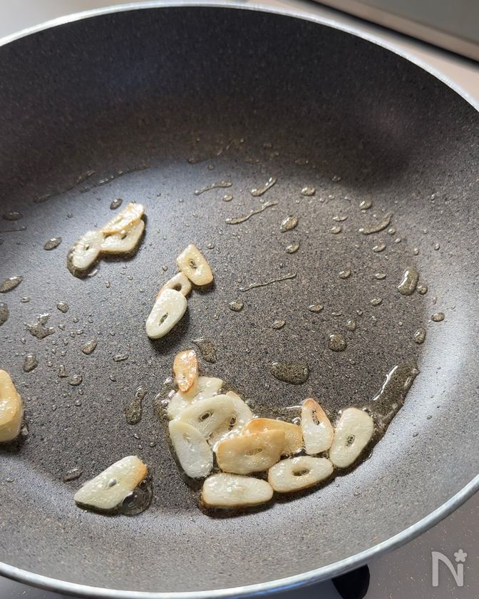 (1) フライパンに米油とにんにく(薄切り)を入れ、弱めの中火にかける。香りが立ったら、焦げないうちににんにくをいったん取り出す。
