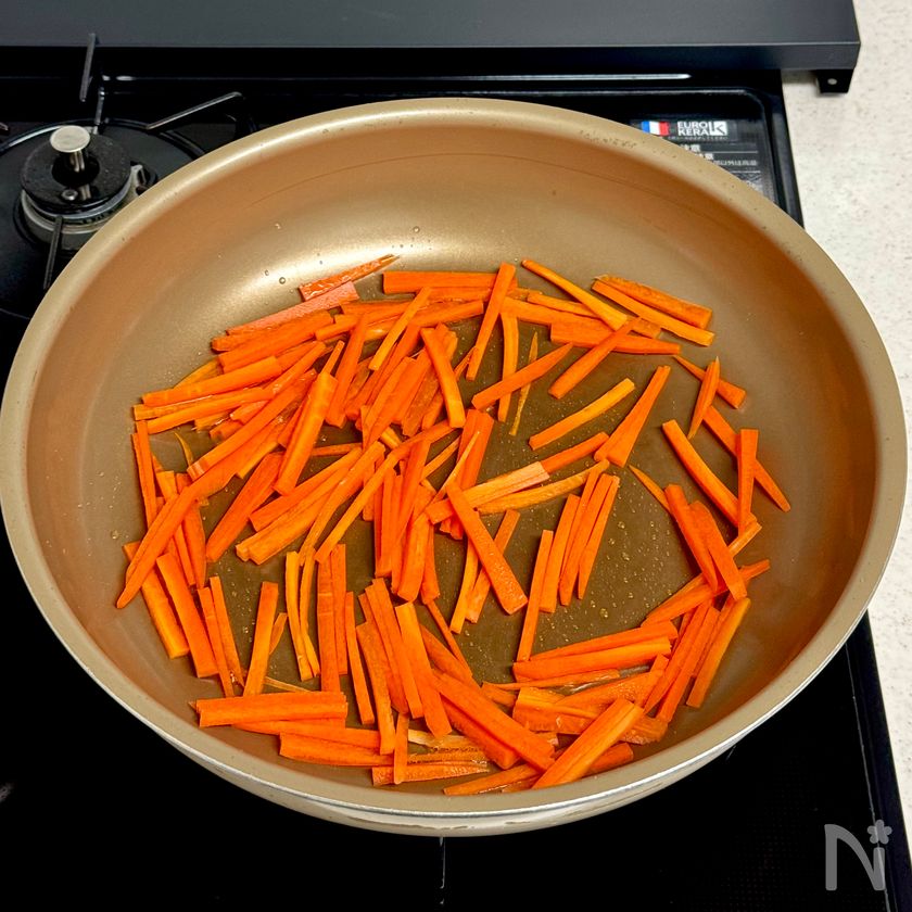 (2) フライパンを中火にかけてごま油をひき、人参を炒める。