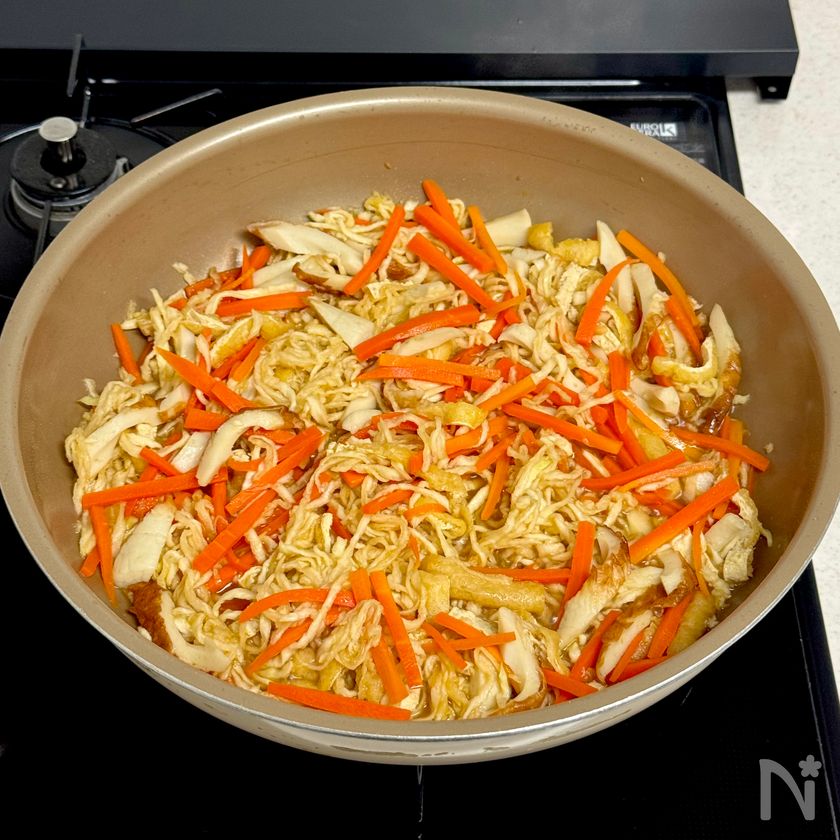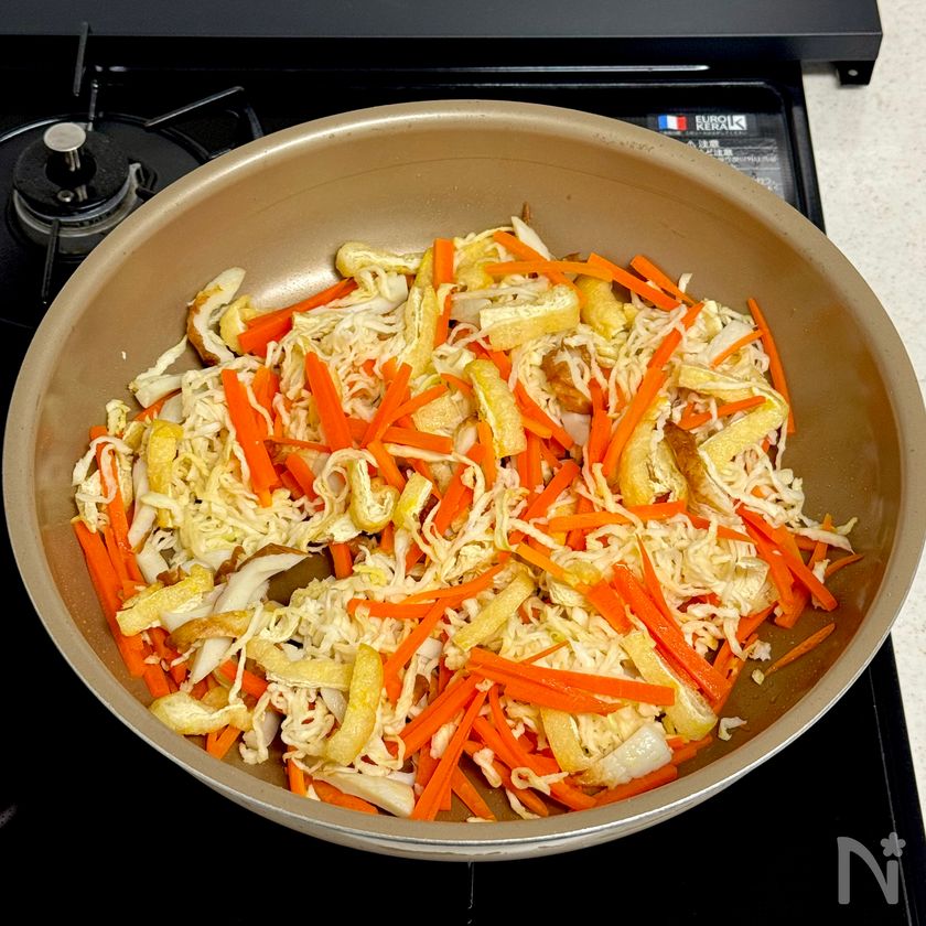 (3) しんなりしたら、切り干し大根、油揚げ、ちくわを加えて炒め合わせる。