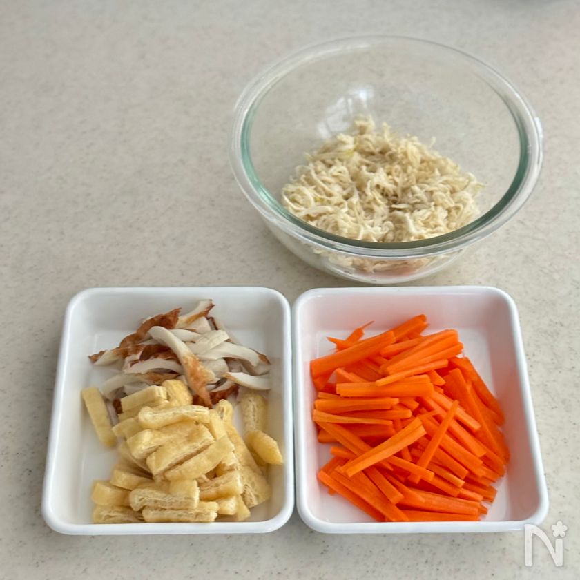 油揚げは熱湯をかけて、油抜きして水気を軽く絞り、縦半分に切ってから7〜8mm幅に切る。