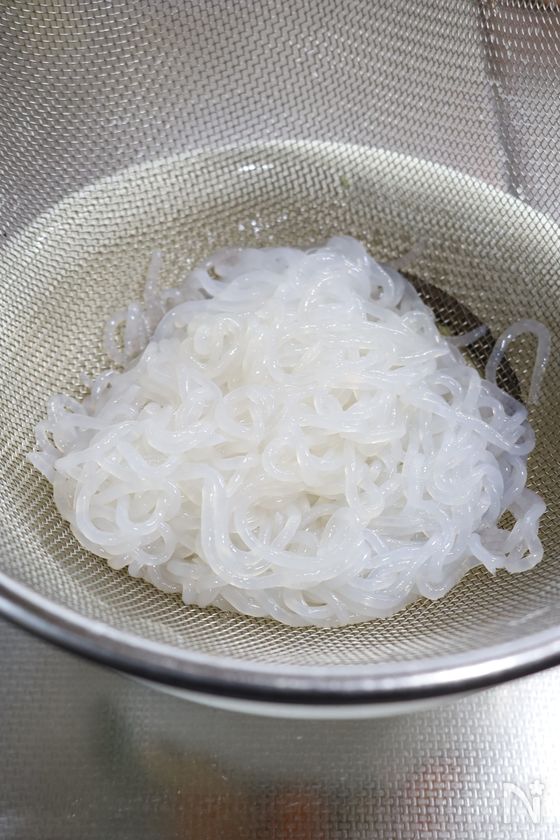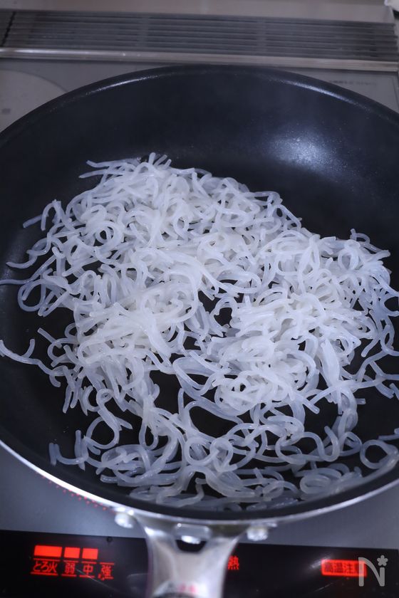 (3) フライパンに油をひかず、白滝を加えてキュッキュッと音がするまで乾煎りする。