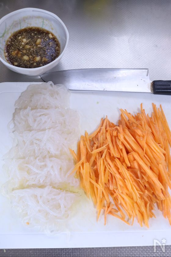 •にんじんの細切りは斜め薄切りにしてから、縦に切ると時短になります。