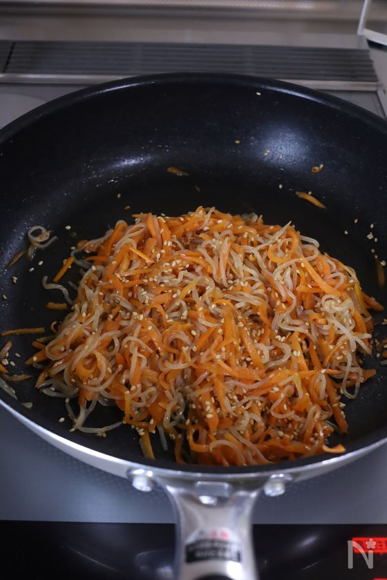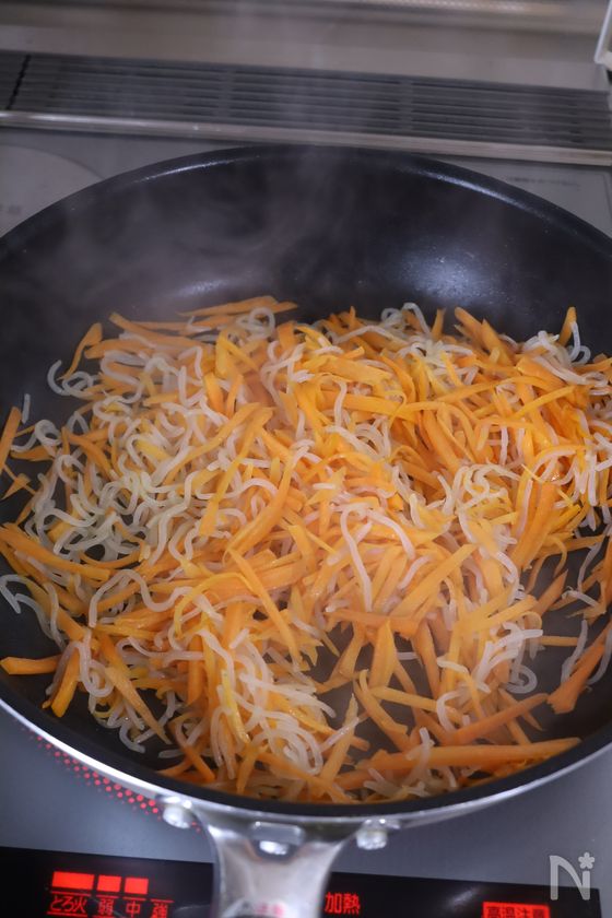 (4) 白滝の水分がとんだら、ごま油、にんじんを加えてにんじんがしんなりするまで炒める。