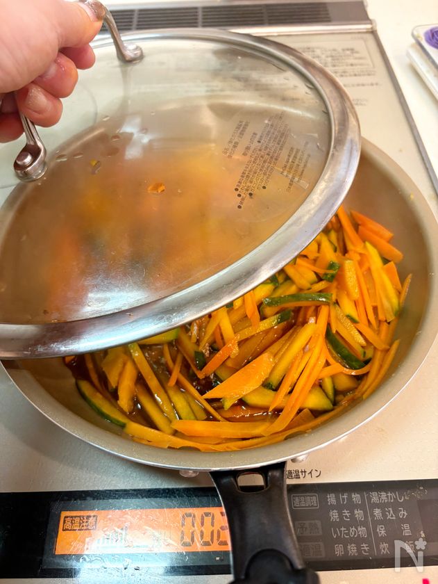 (3) 【A】を入れ軽く混ぜたら蓋をして中火で3分蒸し煮にする。