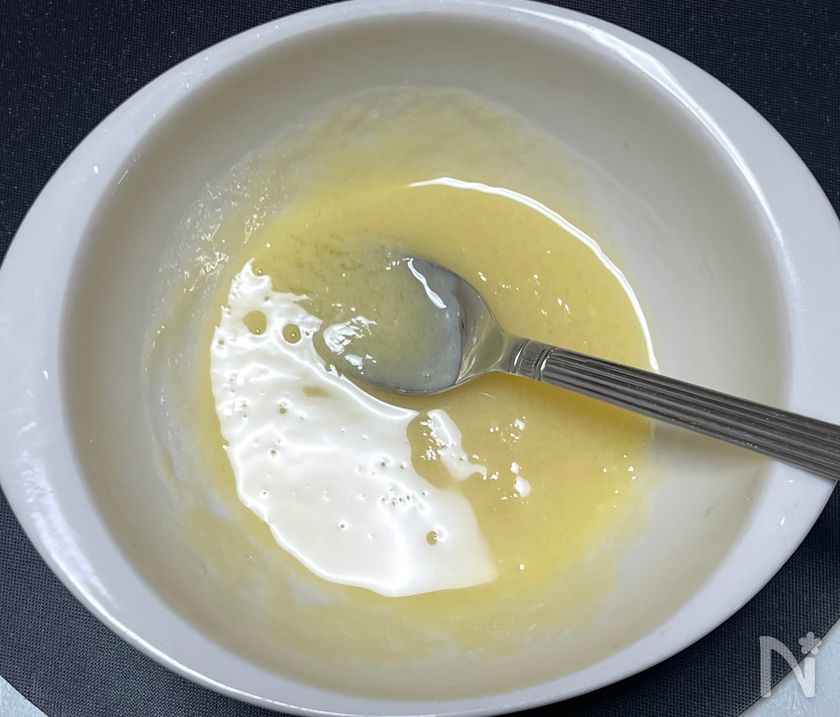 (1) 耐熱容器にホワイトチョコレートを入れ、電子レンジ600wで30秒加熱し、スプーン等で混ぜて溶かす。まだ固まりがあれば10秒くらい追加加熱する。
