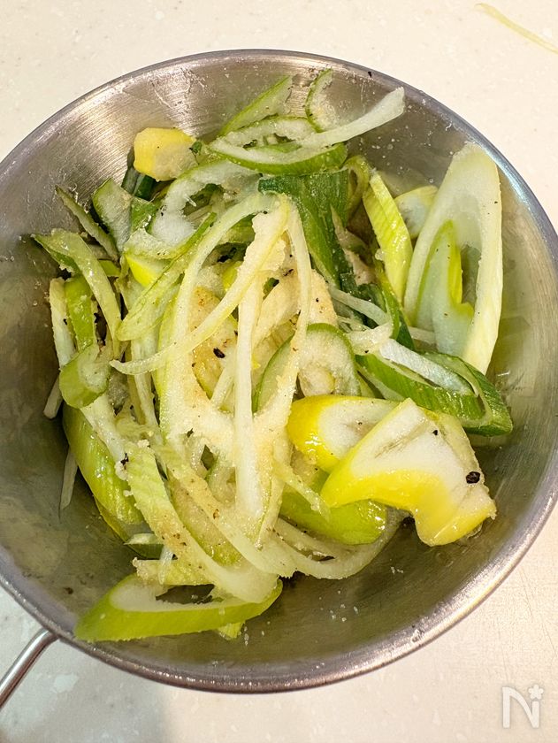 (6) ネギ塩だれで味付ける。