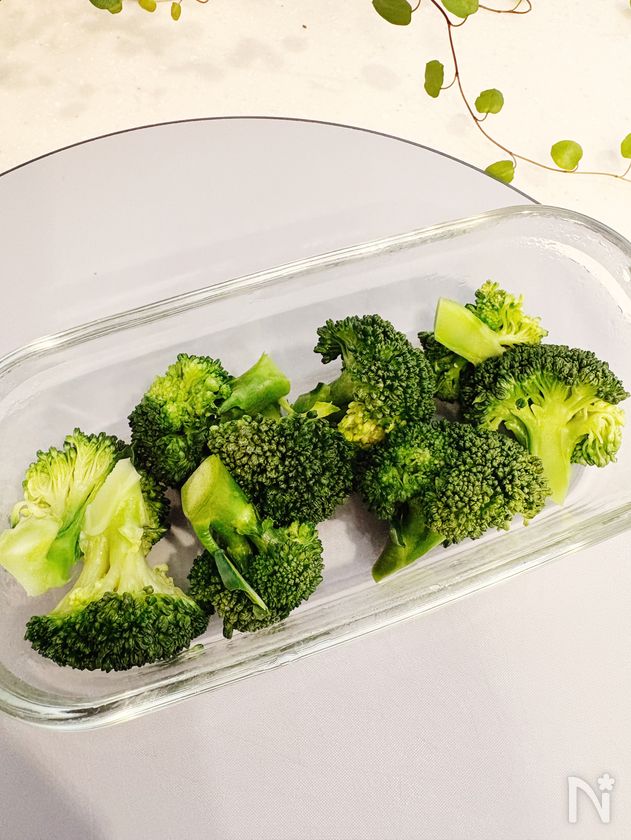 (1) ブロッコリーは水でよく洗い、小房に分けたら耐熱容器に入れ電子レンジ600Wで2分加熱する。