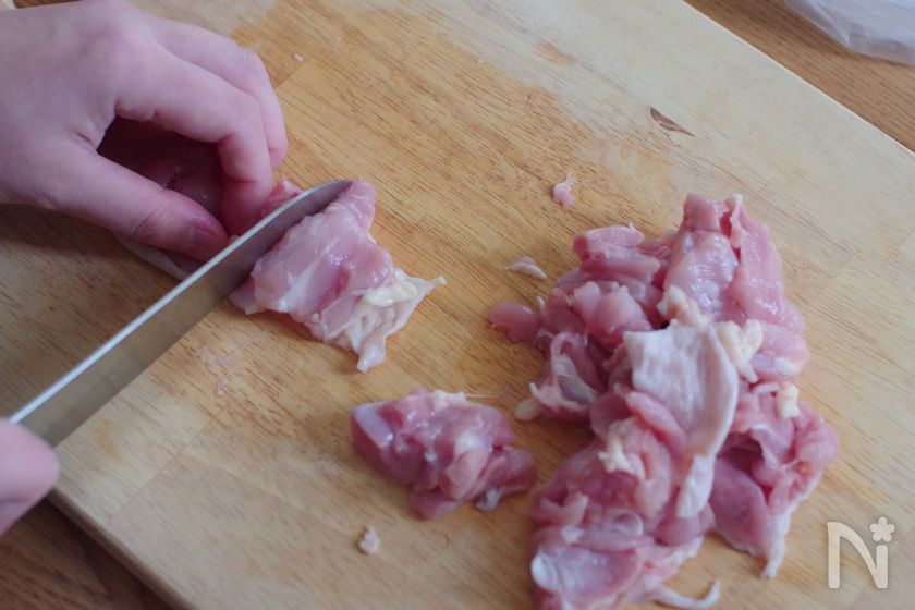 (1) 鶏もも肉を一口サイズに切り、ポリ袋に入れて【A】を加え揉み込んで片栗粉を入れてまぶす。