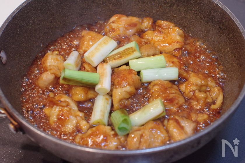 (5) 両面焼けたら【B】を加えて煮からめる。とろみがついてきたら白ねぎを加える。