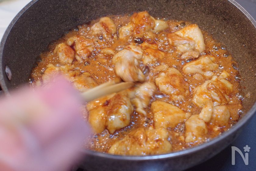 砂糖、みりんが入っているので火力は弱めで混ぜながら絡めるのがポイントです。
