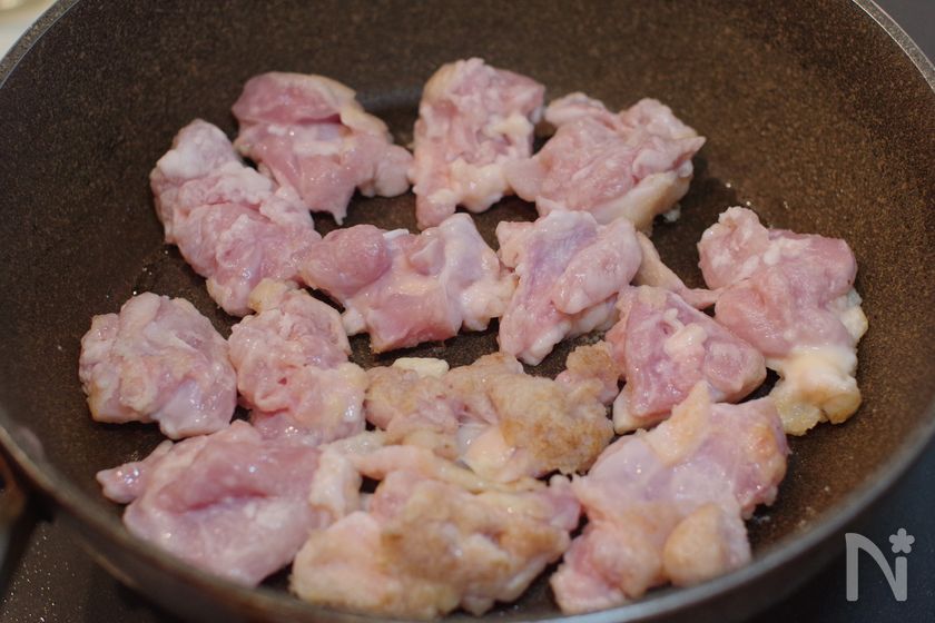 (3) 同じフライパンに鶏もも肉を入れ中火で蓋をして2分焼く。