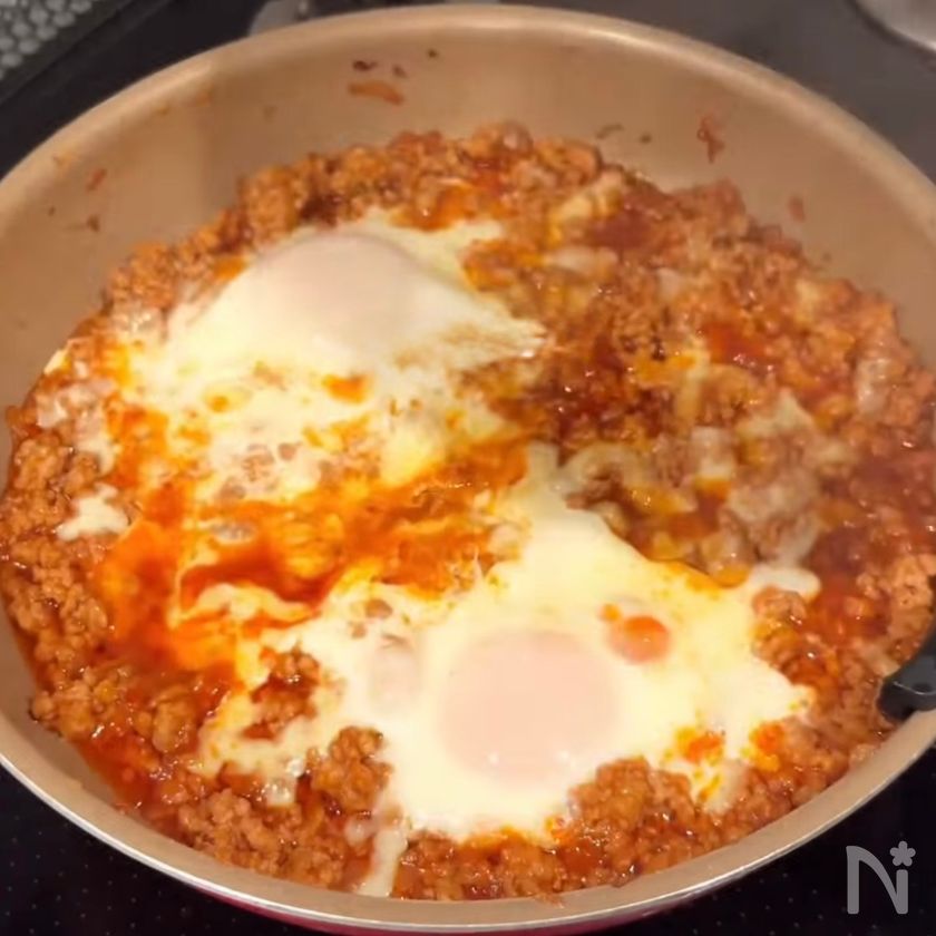 卵を落とし入れ、ピザ用チーズを乗せて蓋をして弱火〜中火で卵に火を通す。