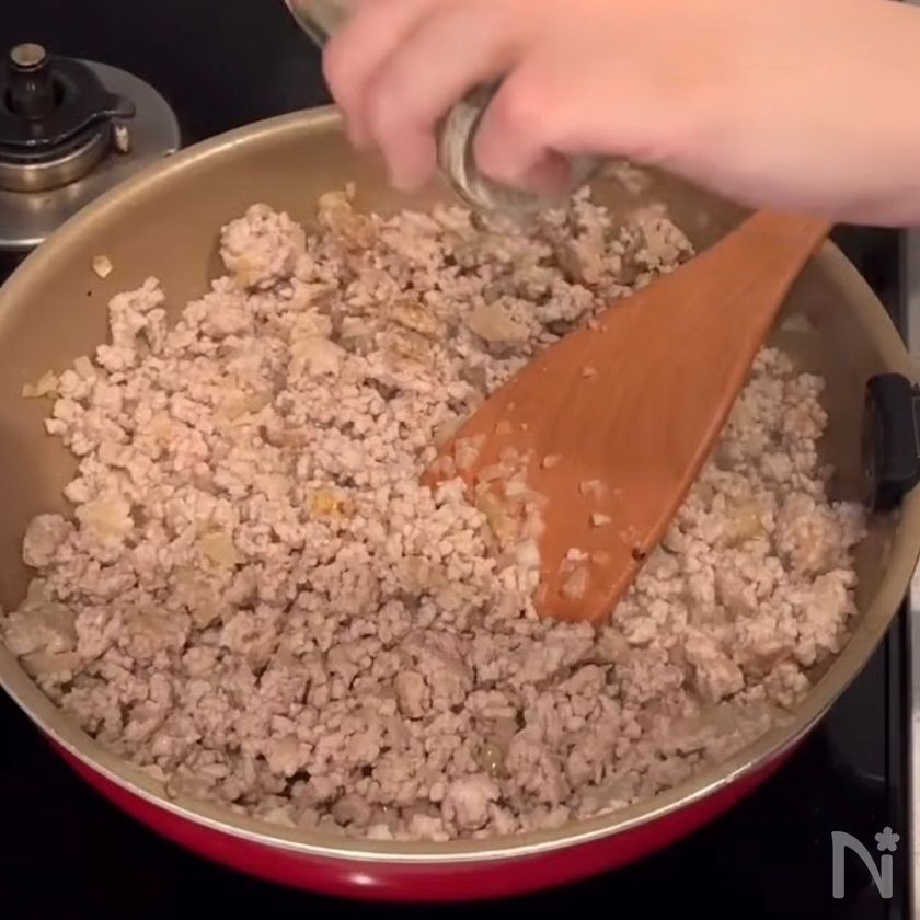 (1) フライパンに油を敷き、玉ねぎと豚ひき肉、塩こしょうを入れて炒める。