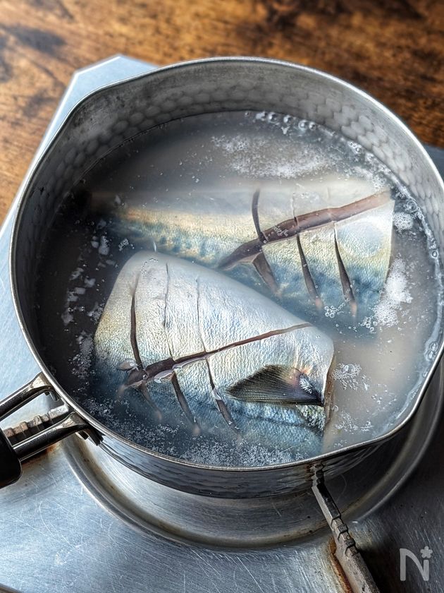 (2) 鍋にお湯をわかし、真鯖を入れ1分下茹でしたら、お湯を捨てる。