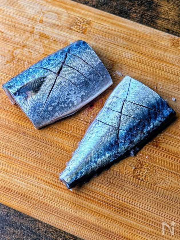 (1) 真鯖は半分に切り、皮目に切り込みを入れ、塩適量(分量外)をふり、10分おいたら綺麗に洗い水けをきる。