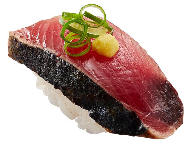 店内で厚切りに切り付けして握っています。かつおのもっちりとした食感が楽しめます。