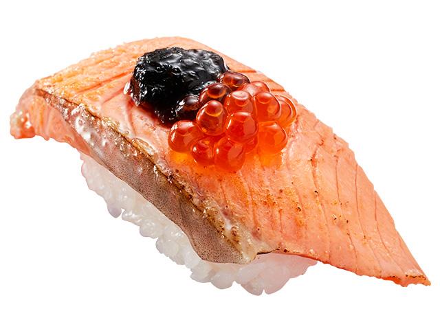 塩をふって炙った大切りサーモンと、濃厚な海苔の佃煮、鱒いくらを組み合わせ、「はらこ飯」風に仕上げています。