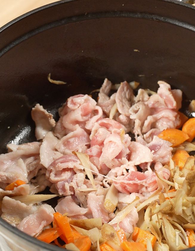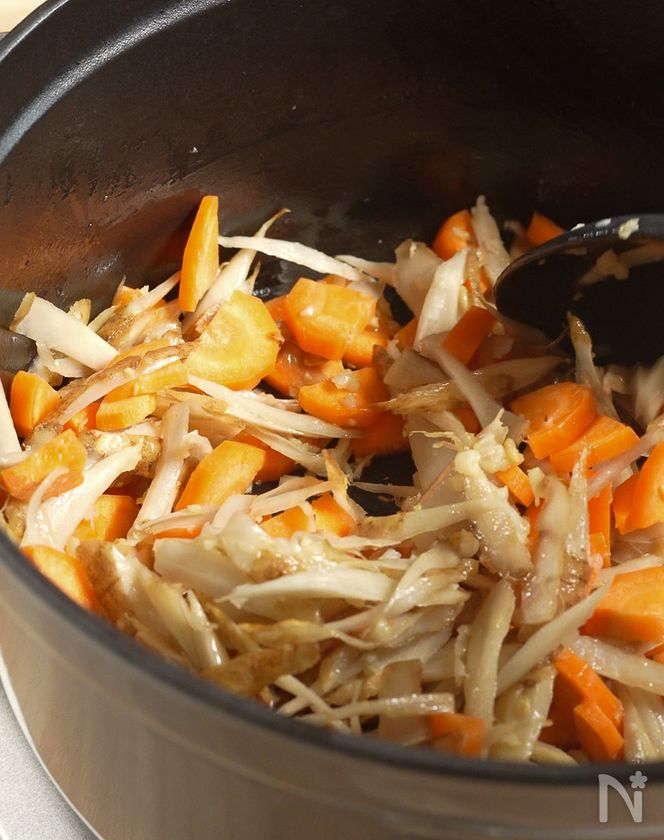 (2) 【炒め工程】鍋に、油を引き中火で生姜・にんにく・ごぼうをじっくり炒める。香りが立ち始め、ごぼうがくたっとしてきたらにんじんを加えさらに炒める。