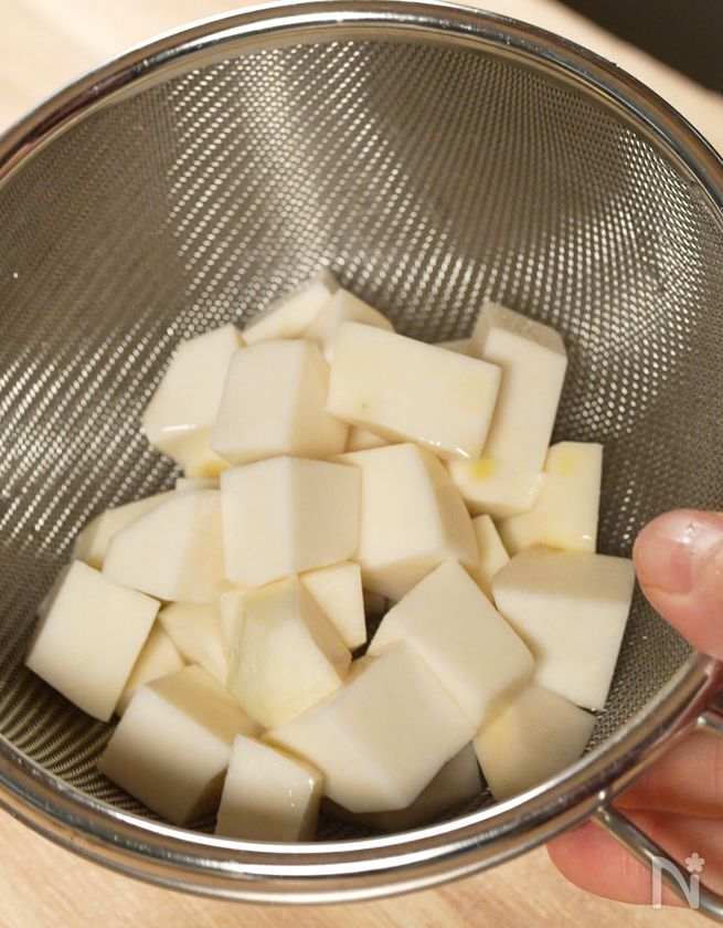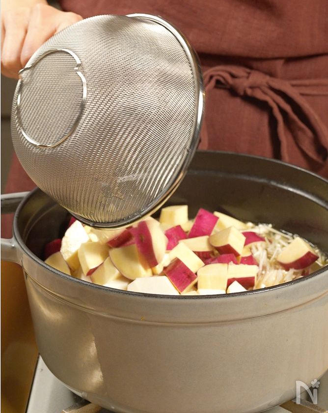 さつまいもと里芋は角切りにし、さつまいもは10分水にさらし里芋は塩(分量外)でさっと揉んで洗い流す。