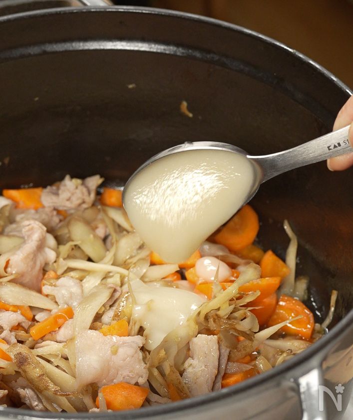 ※鍋底についた旨みを剥がして凝縮させます。